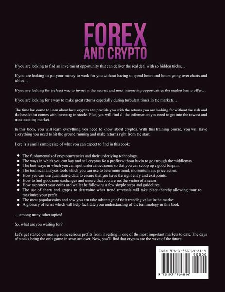 If you are looking to find an investment opportunity that can deliver the real deal with no hidden tricks... If you are looking to put your money to work for you without having to spend hours and hours going over charts and tables... If you are looking for the best way to invest in the newest and most interesting opportunities the market has to offer... If you are looking for a way to make great returns especially during turbulent times in the markets... The time has come to learn about how cryptos can provide you with the returns you are looking for without the risk and the hassle that comes with investing in stocks. Plus, you will find all the information you need to get into the newest and most exciting market. In this book, you will learn everything you need to know about cryptos. With this training course, you will have everything you need to hit the ground running and make returns right from the start. Here is a small sample size of what you can expect to find in this book: ¿The fundamentals of cryptocurrencies and their underlying technology. ¿The ways in which you can buy and sell cryptos for a profits without having to go through the middleman. ¿The best ways in which you can spot undervalued coins so that you can scoop up a good bargain. ¿The technical analysis tools which you can use to determine trend, momentum and price action. ¿How you can use quantitative data to ensure that you have the right entry and exit points. ¿How to find good coin exchanges and ensure that you are not the victim of a scam. ¿How to protect your coins and wallet by following a few simple steps and guidelines. ¿The use of charts and graphs to determine when trend reversals will take place thereby allowing your to maximize your profit ¿The most popular coins and how you can take advantage of their trending value in the market. ¿A glossary of terms which will help facilitate your understanding of the terminology in this book ... among many other topics! So, what are you waiting for? The days of stocks being the only game in town are over. Now, you'll find that cryptos are the wave of the future. So SCROLL UP AND CLICK "ADD TO CART", the time has come to get into the ground floor!