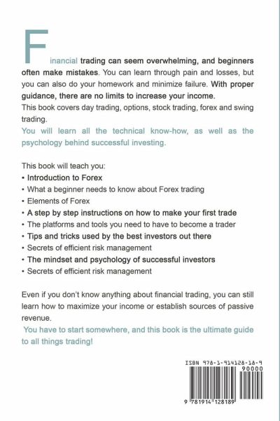 Financial trading can seem overwhelming, and beginners often make mistakes. You can learn through pain and losses, but you can also do your homework and minimize failure. With proper guidance, there are no limits to increase your income. This book covers day trading, options, stock trading, forex and swing trading. You will learn all the technical know-how, as well as the psychology behind successful investing. This book will teach you: · Introduction to Forex · What a beginner needs to know about Forex trading · Elements of Forex · A step by step instructions on how to make your first trade · The platforms and tools you need to have to become a trader · Tips and tricks used by the best investors out there · Secrets of efficient risk management · The mindset and psychology of successful investors · Secrets of efficient risk management Even if you don't know anything about financial trading, you can still learn how to maximize your income or establish sources of passive revenue. You have to start somewhere, and this book is the ultimate guide to all things trading!