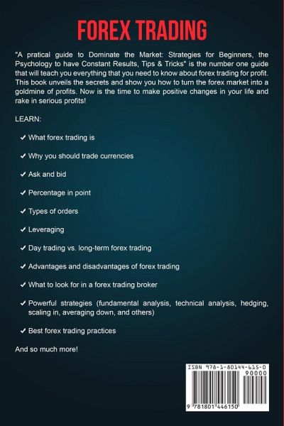 This eBook is the number one guide that will teach you everything that you need to know about forex trading for profit. The ebook unveils the secrets and show you how to turn the forex market into a goldmine of profits. Now is the time to make positive changes in your life and rake in serious profits! LEARN: What forex trading is Why you should trade currencies Ask and bid Percentage in point Types of orders Leveraging Day trading vs. long-term forex trading Advantages and disadvantages of forex trading What to look for in a forex trading broker Powerful strategies (fundamental analysis, technical analysis, hedging, scaling in, averaging down, and others) Best forex trading practices ...and Much More! WHAT'S IN THE BOOK? Chapter 1 talks about the basics of forex trading to give you a good understanding of what forex is all about. Chapter 2 discusses the advantages and disadvantages of forex trading. Chapter 3 lays down the set criteria to look for in a forex trading broker. Chapter 4 reveals the powerful forex trading strategies that you can use to significantly increase your chances of success. Chapter 5 talks about the best forex trading practices. Don't wait any longer!