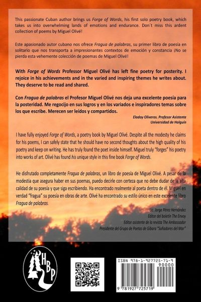 This passionate Cuban author brings us Forge of Words, his first solo poetry book, which takes us into overwhelming lands of emotions and endurance. Don´t miss this ardent collection of poems by Miguel Olivé! Este apasionado autor cubano nos ofrece Fragua de palabras, su primer libro de poesía en solitario que nos transporta a impresionantes contextos de emoción y constancia ¡No se pierda esta vehemente colección de poemas de Miguel Olivé!