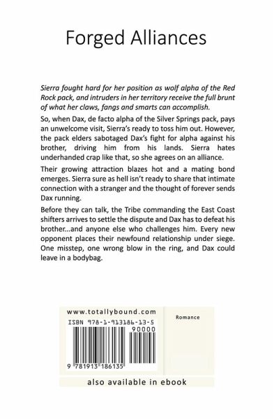 Sierra and Dax's alliance is already rocky. He's a cocky wiseass, and she doesn't put up with bullshit. So, when a mating bond appears between them, it threatens to send them both running. Sierra Kanoska fought hard for her position as wolf alpha of the Red Rock pack, and intruders in her territory receive the full brunt of what her claws, fangs and smarts can accomplish. So, when Dax Williams, de facto alpha of the Silver Springs pack, pays an unwelcome visit, Sierra's ready to toss him out. However, the pack elders sabotaged Dax's fight for alpha against his brother, driving him from his lands. Sierra hates underhanded crap like that, so she agrees on an alliance. As they work together, she witnesses an alpha who wants to do right by his pack, not just a cocky wiseass. Their growing attraction blazes hot, but the moment she and Dax lock lips, a mating bond emerges. Sierra sure as hell isn't ready to share that intimate connection with a stranger and the thought of forever sends Dax running. Before they can talk, the Tribe commanding the East Coast shifters arrives to settle the dispute. Dax and his brother's punishment for their pack's civil war is a free-for-all on their lands. Not only does he have to defeat his brother, but any challenger in the region. Despite Dax and Sierra's initial resistance, his wily charm relaxes her control-freak tendencies while her steadfast support bolsters his strength. Yet every new opponent places their newfound relationship under siege-one misstep, one wrong blow in the ring, and Dax could leave in a bodybag.