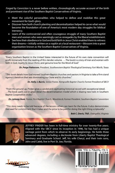 -ABOUT THE BOOK: Forged by Conviction is a never before written, chronologically accurate account of the birth and prominent rise of the Southern Baptist Conservatives of Virginia. Meet the colorful personalities who helped to define and mobilize this great movement for God's glory. Discover how both church planting and decentralization helped to carve what would become the foundation of one of America's most modern day struggles for biblical inerrancy. Learn of the controversial and often courageous struggle of many Southern Baptist men and women who were seemingly cast as renegades by the liberal establishment. See how their obedience to God and bold faith in Jesus Christ enabled them to witness their dreams-initially written on a napkin at a local restaurant-blossom into a great organization known as the Southern Baptist Conservatives of Virginia. -ABOUT THE AUTHOR: Jeffrey Pinder has been in full-time ministry for over twenty-five years. Aligned with the SBCV since its inception in 1996, he has had a unique vantage point from which to observe its early beginnings. He holds three advanced degrees, including a doctorate from Liberty Baptist Theological Seminary and Graduate School. Jeff, his wife Cheryl, and their twin sons, John and Caleb, live in Port St. Joe, Florida. -ABOUT THE PUBLISHER: Innovo Publishing LLC a multimedia publisher located near Memphis, TN. Since 2008, Innovo has published quality books, eBooks, audiobooks, music, screenplays, and curricula for authors, artists, and organizations within Christian and wholesome markets. Innovo's capabilities and global reach provide authors, artists and ministries access to the world for Christ. To learn more about Innovo Publishing, visit our website at innovopublishing.com. To connect with other Christian creatives and to learn best practices for creating, publishing, marketing, and selling Christian titles, visit the Christian Publishing Portal at cpportal.com.