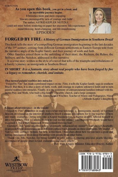 Hard-working and straightforward people of unshakable faith who leave footprints that their descendants will follow! The book, written in a romantic style, will absorb you. You will be involved in stories of secure and resilient families who build successful companies. The Author is Astrid Kepler Neitzke. Her father, Otto Kepler, is a first-generation immigrant. Her grandfather, Adolfo, was a courageous and tireless explorer, who came from Europe as a teenager. The Kepler Weber company started with blacksmithing and is today known worldwide in the agribusiness sector in the post-harvest stage of the grain production chain. Astrid is his youngest daughter, who was born when her parents' life was at its peak. As a baby of four months, she loses her father! What he left behind gave her lasting impressions that shaped the course of her life. A huge treasure! Her mother, Fanny Stillner Kepler, continues to lead the family, keeping them happy together in the small town called initially New Württemberg and today Panambi, where until the Second World War, they also spoke the German language. Astrid discovers that her grandfather, Vincenz Stillner, a native of Austria, was a street boy in Vienna, who became a beloved and respected pastor in Porto Alegre, Brazil. The Kepler family continues to work and have faith. Other families are connected, like the Richters, the Rehns, the Stillners, and the Neitzkes. Astrid marries Ari Neitzke. The Author upholds the cheerful and adventurous humor she inherited. People forged by fire which left a legacy to be remembered and imitated.