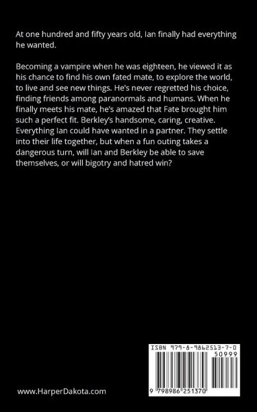 At one hundred and fifty years old, Ian finally had everything he wanted. Becoming a vampire when he was eighteen, he viewed it as his chance to find his own fated mate, to explore the world, to live and see new things. He's never regretted his choice, finding friends among paranormals and humans. When he finally meets his mate, he's amazed that Fate brought him such a perfect fit. Berkley's handsome, caring, creative. Everything Ian could have wanted in a partner. They settle into their life together, but when a fun outing takes a dangerous turn, will Ian and Berkley be able to save themselves, or will bigotry and hatred win?