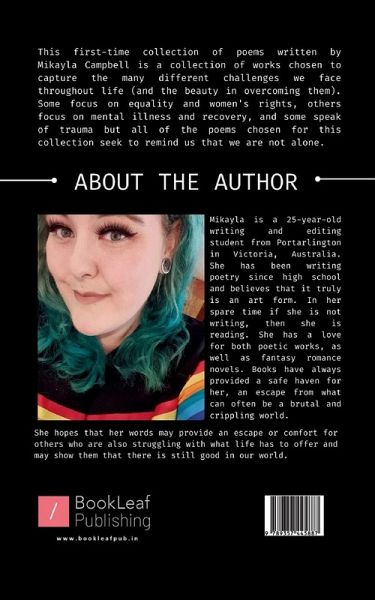 This first-time collection of poems written by Mikayla Campbell is a collection of works chosen to capture the many different challenges we face throughout life (and the beauty in overcoming them). Some focus on equality and womens rights, others focus on mental illness and recovery, and some speak of trauma but all of the poems chosen for this collection seek to remind us that we are not alone.