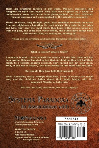 There are creatures lurking in our world. Obscure creatures long relegated to myth and legend. They have been sighted by a lucky-or unlucky-few, some have even been photographed, but their existence remains unproven and unrecognized by the scientific community. These creatures, long thought gone, have somehow survived; creatures from our nightmares haunting the dark places. They swim in our lakes and bays, they soar the night skies, they hunt in the woods. Some are from our past, and some from other worlds, and others have always been with us-watching us, fearing us, hunting us. These are the cryptids, and Systema Paradoxa tells their tales. *** What is legend? What is truth? A monster is said to lurk beneath the waters of Lake Erie. Jane and her twin brother Rob are haunted by just that. As children, they lost half their family to a terrible boating accident. They haven't left dry land since. Only, at the age of sixteen, they allow friends to lure them onto the lake. But should they have held their ground? When something nearly swamps their boat, years of secrecy are swept away and the children's father shares their family history with the supposed Monster of Lake Erie. Will the tale bring closure or just more tragedy?