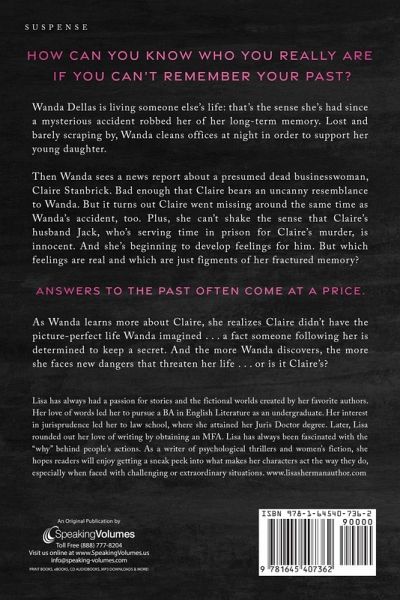 How can you know who you really are if you can't remember your past? Wanda Dellas is living someone else's life: that's the sense she's had since a mysterious accident robbed her of her long-term memory. Lost and barely scraping by, Wanda cleans offices at night in order to support her young daughter. Then Wanda sees a news report about a presumed dead businesswoman, Claire Stanbrick. Bad enough that Claire bears an uncanny resemblance to Wanda. But it turns out Claire went missing around the same time as Wanda's accident, too. Plus, she can't shake the sense that Claire's husband Jack, who's serving time in prison for Claire's murder, is innocent. And she's beginning to develop feelings for him. But which feelings are real and which are just figments of her fractured memory? Answers to the past often come at a price. As Wanda learns more about Claire, she realizes Claire didn't have the picture-perfect life Wanda imagined . . . a fact someone following her is determined to keep a secret. And the more Wanda discovers, the more she faces new dangers that threaten her life . . . or is it Claire's?