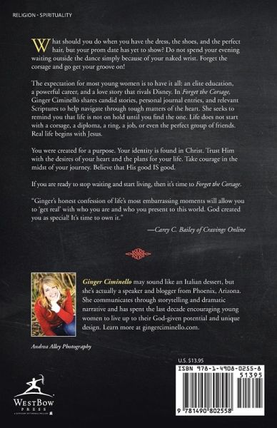 What should you do when you have the dress, the shoes, and the perfect hair, but your prom date has yet to show? Do not spend your evening waiting outside the dance simply because of your naked wrist. Forget the corsage and go get your groove on! The expectation for most young women is to have it all: an elite education, a powerful career, and a love story that rivals Disney. In Forget the Corsage, Ginger Ciminello shares candid stories, personal journal entries, and relevant Scriptures to help navigate through tough matters of the heart. She seeks to remind you that life is not on hold until you find the one. Life does not start with a corsage, a diploma, a ring, a job, or even the perfect group of friends. Real life begins with Jesus. You were created for a purpose. Your identity is found in Christ. Trust Him with the desires of your heart and the plans for your life. Take courage in the midst of your journey. Believe that His good IS good. If you are ready to stop waiting and start living, then it’s time to Forget the Corsage. "Ginger’s honest confession of life’s most embarrassing moments will allow you to ‘get real’ with who you are and who you present to this world. God created you as special! It’s time to own it." —Carey C. Bailey of Cravings Online