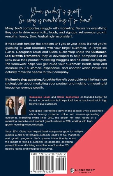 Your product is great. So why is marketing it so hard? Many SaaS companies struggle with marketing. Teams try everything they can to drive more traffic, leads, and signups. Yet revenue growth remains...lumpy. Slow. Frustratingly inconsistent. If this sounds familiar, the problem isn't you or your ideas; it's that you're guessing at what resonates with your target customers. In Forget the Funnel, Georgiana Laudi and Claire Suellentrop share the Customer-Led Growth Framework they've developed to help companies of all sizes solve their product marketing struggles and hit ambitious targets. This framework helps you get inside your customers' heads, map and measure your customers' experience, and uncover which tactics will actually move the needle for your company. It's time to stop guessing. Forget the Funnel is your guide for thinking more strategically about marketing your product and making a meaningful impact on revenue growth.