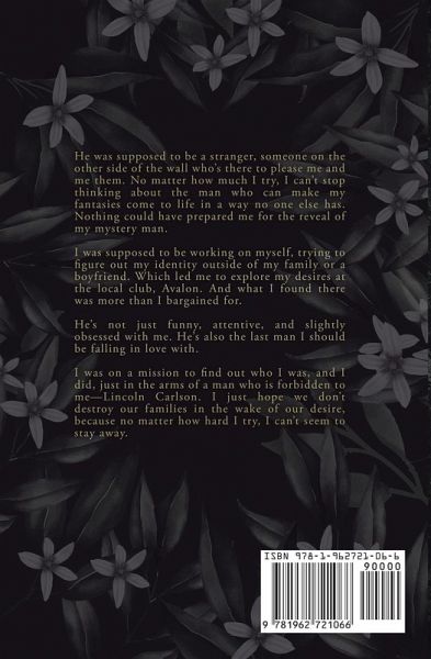 He was supposed to be a stranger, someone on the other side of the wall who's there to please me and me them. No matter how much I try, I can't stop thinking about the man who can make my fantasies come to life in a way no one else has. Nothing could have prepared me for the reveal of my mystery man. I was supposed to be working on myself, trying to figure out my identity outside of my family or a boyfriend. Which led me to explore my desires at the local club, Avalon. And what I found there was more than I bargained for. He's not just funny, attentive, and slightly obsessed with me. He's also the last man I should be falling in love with. I was on a mission to find out who I was, and I did, just in the arms of a man who is forbidden to me-Lincoln Carlson. I just hope we don't destroy our families in the wake of our desire, because no matter how hard I try, I can't seem to stay away.