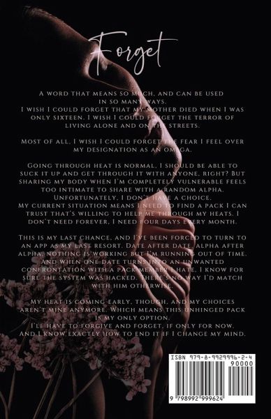 Forget. A word that means so much, and can be used in so many ways. I wish I could forget that my mother died when I was only sixteen. I wish I could forget the terror of living alone and on the streets. Most of all, I wish I could forget the fear I feel over my designation as an omega. Going through heat is normal, I should be able to suck it up and get through it with anyone, right? But sharing my body when I'm completely vulnerable feels too intimate to share with a random alpha. Unfortunately, I don't have a choice. My current situation means I need to find a pack I can trust that's willing to help me through my heats. I don't need forever, I need four days every month. This is my last chance, and I've been forced to turn to an app as my last resort. Date after date, alpha after alpha, nothing is working but I'm running out of time. And when one date turns into an unwanted confrontation with a pack member I hate, I know for sure the system was hacked. There's no way I'd match with him otherwise. My heat is coming early, though, and my choices aren't mine anymore. Which means this unhinged pack is my only option. I'll have to forgive and forget, if only for now. And I know exactly how to end it if I change my mind. *Forget is Aisling's story. There will be groveling, knots, and a knife wound or two.*