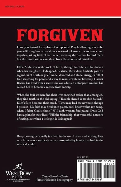 Have you longed for a place of acceptance? People allowing you to be yourself? Forgiven is based on a network of women who have come together, asking little of each other, realizing the past has formed them but the future will release them from the secrets and mistakes. Ellen Anderson is the rock of faith, though her life will be shaken when her daughter is kidnapped. Beatrice, the widow, finds life goes on regardless of death or grief. Anne, divorced and alone, struggles full of fear, searching for peace and a way to reunite with her little boy. Harriet Becker has lived with a secret; she considers an unforgiven sin that has caused her to become a recluse from society. When the four women find their lives entwined rather than entangled, they find truth in the old saying, "Trouble shared is trouble halved." Ellen's faith becomes their creed. "Time may lead me nowhere, though I press on. My faith may break into pieces, but I know within my being, when I falter God is there." Will each woman find peace? Does God have a plan for their lives? Will the friendship, that wonderful network of caring, last when a little girl is kidnapped?