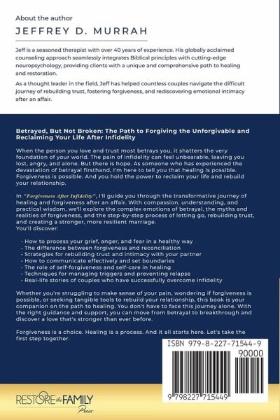 Betrayed, But Not Broken: The Path to Forgiving the Unforgivable and Reclaiming Your Life After Infidelity When the person you love and trust most betrays you, it shatters the very foundation of your world. The pain of infidelity can feel unbearable, leaving you lost, angry, and alone. You may find yourself questioning everything you once believed about your relationship, your partner, and even yourself. The road ahead may seem dark and uncertain, filled with insurmountable obstacles and challenges. But there is hope. As someone who has experienced the devastation of betrayal firsthand, I'm here to tell you that healing is possible. Forgiveness is possible. And you hold the power to reclaim your life and rebuild your relationship, one courageous step at a time. In "Forgiveness After Infidelity," I'll guide you through the transformative journey of healing and forgiveness after an affair. With compassion, understanding, and practical wisdom, we'll explore the complex emotions of betrayal, the myths and realities of forgiveness, and the step-by-step process of letting go, rebuilding trust, and creating a stronger, more resilient marriage. You'll discover:How to process your grief, anger, and fear in a healthy way without getting stuck in a cycle of negativity and despair The crucial difference between forgiveness and reconciliation, and why understanding this distinction is key to your healing Proven strategies for rebuilding trust and intimacy with your partner, even when it feels like all is lost Effective communication techniques and boundary-setting tools to help you navigate difficult conversations and protect your emotional well-being The essential role of self-forgiveness and self-care in the healing process and how to cultivate a strong, loving relationship with yourself Powerful techniques for managing triggers, overcoming setbacks, and preventing relapse so you can maintain your progress and build resilience Real-life stories of couples who have successfully overcome infidelity, offering hope, inspiration, and practical guidance for your own journey Whether you're struggling to make sense of your pain, wondering if forgiveness is possible, or seeking tangible tools to rebuild your relationship, this book is your companion on the path to healing. With its perfect blend of empathy, insight, and actionable advice, "Forgiveness After Infidelity" offers a roadmap through the wilderness of betrayal, guiding you towards a future of renewed trust, deeper intimacy, and unshakable love. You don't have to face this journey alone. With the right guidance and support, you can move from betrayal to breakthrough, from shattered dreams to extraordinary resilience, and from the depths of despair to the heights of rediscovered joy. You can emerge from this trial stronger, wiser, and more deeply connected to yourself and your partner than ever before. Forgiveness is a choice. Healing is a process. And it all starts here, within the pages of this life-changing book. If you're ready to take the first step towards reclaiming your life and your love, then "Forgiveness After Infidelity" is your invitation to embark on the most important journey of your life. Don't let betrayal define your story, and don't let the wounds of the past dictate your future. Instead, choose the path of courage, compassion, and unwavering commitment to your own healing and growth. Choose the path of forgiveness, resilience, and extraordinary love.