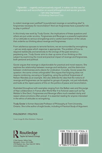 Forgiveness and Revenge is a powerful exploration of our attitudes to serious wrongdoings and a careful examination of the values that underlie our thinking about revenge and forgiveness. From adulterous spouses to terrorist factions, we are surrounded by wrongdoing, yet we rarely agree which response is appropriate. The problem of how to respond realistically and sensitively to the wrongs of the past remains a perplexing one. Trudy Govier clarifies our thinking on this subject by examining the moral and practical impact of revenge and forgiveness, both personal and political. Forgiveness and Revenge offers much-needed clarity and reason where emotions often prevail. It is essential reading for anyone interested in the ethics of attitudes to wrongdoing.