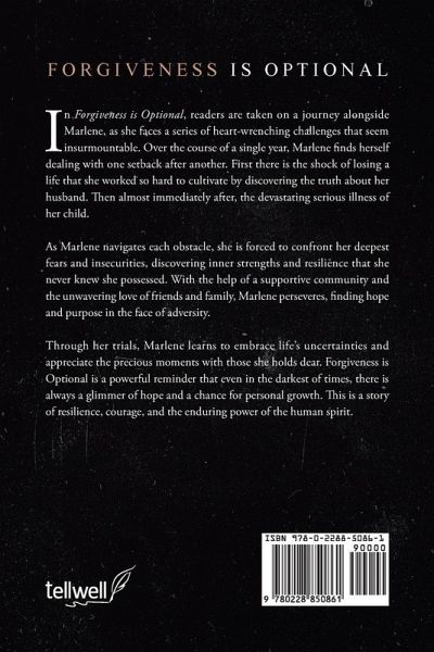 In Forgiveness is Optional, readers are taken on a journey alongside Marlene, as she faces a series of heart-wrenching challenges that seem insurmountable. Over the course of a single year, Marlene finds herself dealing with one setback after another. First there is the shock of losing a life that she worked so hard to cultivate by discovering the truth about her husband. Then almost immediately after, the devastating serious illness of her child. As Marlene navigates each obstacle, she is forced to confront her deepest fears and insecurities, discovering inner strengths and resilience that she never knew she possessed. With the help of a supportive community and the unwavering love of friends and family, Marlene perseveres, finding hope and purpose in the face of adversity. Through her trials, Marlene learns to embrace life's uncertainties and appreciate the precious moments with those she holds dear. Forgiveness is Optional is a powerful reminder that even in the darkest of times, there is always a glimmer of hope and a chance for personal growth. This is a story of resilience, courage, and the enduring power of the human spirit.