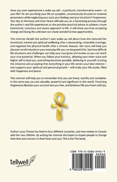 Have you ever experienced a wake-up call - a profound, transformative event - in your life? Or are you living your life on autopilot, unconsciously focused on material possessions while neglecting your soul, your feelings and your intuitions? Forgiveness: Your Key to Harmony and Inner Peace will take you on a fascinating journey through the author's real-life experiences as she provides practical advice to achieve a more intentional, conscious and aware approach to life. It will show you how accepting change and facing the unknown can create wonderful new opportunities. This memoir details the author's own wake-up call about how she restored her emotional, mental and spiritual wellbeing after a devastating, miserable marriage, and regained her physical health after a chronic disease. Her story will help you discover small miracles in your everyday life you can be grateful for. See how difficult life situations and challenges can help your soul grow and evolve so you can reach your true potential. When you follow your instincts, allowing your inner voice and higher self to lead you, everything becomes possible. Believing in yourself, trusting the Universe and accepting that everything in your life serves your best interest - and supports your spiritual and personal growth - will make your life easier, filled with happiness and peace. This memoir will help you to remember that you are loved, worthy and complete. In the same way, you are valuable, powerful and significant in this world. Practicing forgiveness liberates your soul and sets you free, and kindness fills your heart with joy.