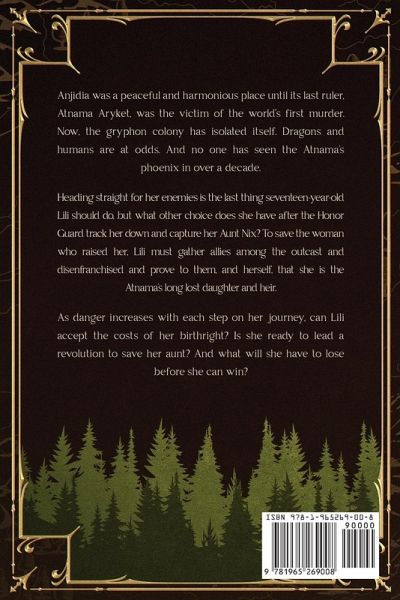 Blind faith is an incredible thing-an incredible, scary thing. Anjidia was a peaceful and harmonious place until its last ruler, Atnama Aryket, was the victim of the world's first murder. Now, the gryphon colony has isolated itself. Dragons and humans are at odds. And no one has seen the Atnama's phoenix in over a decade. Heading straight for her enemies is the last thing seventeen-year-old Lili should do, but what other choice does she have after the Honor Guard track her down and capture her Aunt Nix? To save the woman who raised her, Lili must gather allies among the outcast and disenfranchised and prove to them, and herself, that she is the Atnama's long lost daughter and heir. As danger increases with each step on her journey, can Lili accept the costs of her birthright? Is she ready to lead a revolution to save her aunt? And what will she have to lose before she can win?