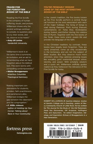 You're probably missing some of the most interesting books of the Bible.In the Jewish tradition, the five books known as "The Five Scrolls" perform a central liturgical function as the texts associated with each of the major holidays. The Song of Songs is read during Passover, Ruth during Shavuot, Lamentations on Tisha B'av, Ecclesiastes during Sukkot, and Esther during the celebration of Purim. Together with the five books of the Torah, these texts orient Jewish life and provide the language of the faith.In the Christian tradition, by contrast, these books have largely been forgotten. Many churchgoers can't even find them in their pew Bibles. They are rarely preached, come up only occasionally in the lectionary, and are not the subject of Bible studies. Thus, their influence on the lives and theology of many Christians is entirely negligible. But they deserve much more attention. With scholarly wisdom and a quick wit, Williamson insists that these books speak urgently to the pressing issues of the contemporary world. Addressing themes of human sexuality, grief, immigration, suffering and protest, ethnic nationalism, and existential dread, he skillfully guides readers as they rediscover the relevance of the Five Scrolls for today.