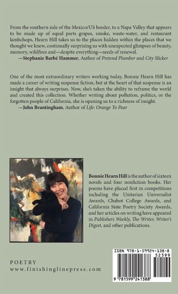From the southern side of the Mexico/US border, to a Napa Valley that appears to be made up of equal parts grapes, smoke, waste-water, and restaurant lambchops, Hearn Hill takes us to the places hidden within the places that we thought we knew, continually surprising us with unexpected glimpses of beauty, memory, wildfires and-despite everything-seeds of renewal.-Stephanie Barbé Hammer, Author of Pretend Plumber and City Slicker One of the most extraordinary writers working today, Bonnie Hearn Hill has made a career of writing suspense fiction, but at the heart of that suspense is an insight that always surprises. Now, she's taken the ability to reframe the world and created this collection. Whether writing about pollution, politics, or the forgotten people of California, she is opening us to a richness of insight.-John Brantingham, Author of Life: Orange To Pear