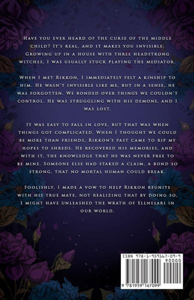 Have you ever heard of the curse of the middle child? It's real, and it makes you invisible. Growing up in a house with three headstrong witches, I was usually stuck playing the mediator. When I met Rikkon, I immediately felt a kinship to him. He wasn't invisible like me, but in a sense, he was forgotten. We bonded over things we couldn't control. He was struggling with his demons, and I was lost. It was easy to fall in love, but that was when things got complicated. When I thought we could be more than friends, Rikkon's past came to rip my hopes to shreds. He recovered his memories, and with it, the knowledge that he was never free to be mine. Someone else had staked a claim, a bond so strong, that no mortal human could break. Foolishly, I made a vow to help Rikkon reunite with his true mate, not realizing that by doing so, I might have unleashed the wrath of Ellnesari in our world.