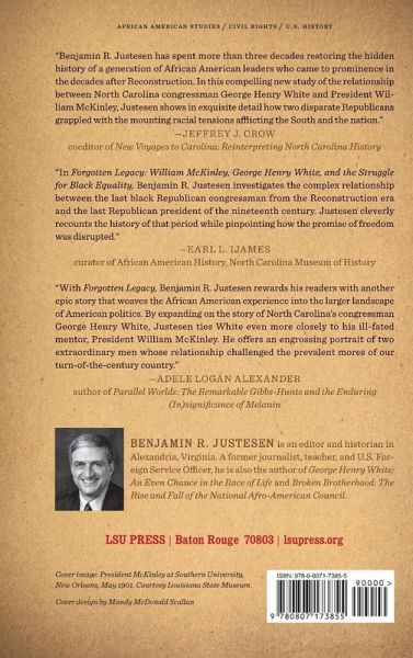 In Forgotten Legacy, Benjamin R. Justesen reveals a previously unexamined facet of William McKinley's presidency: an ongoing dedication to the advancement of African Americans, including their appointment to significant roles in the federal government and the safeguarding of their rights as U.S. citizens. During the first two years of his administration, McKinley named nearly as many African Americans to federal office as all his predecessors combined. He also acted on many fronts to stiffen federal penalties for participation in lynch mobs and to support measures promoting racial tolerance. Indeed, Justesen's work suggests that McKinley might well be considered the first "civil rights president," especially when compared to his next five successors in office. Nonetheless, historians have long minimized, trivialized, or overlooked McKinley's cooperative relationships with prominent African American leaders, including George Henry White, the nation's only black congressman between 1897 and 1901. Justesen contends that this conventional, one-sided portrait of McKinley is at best incomplete and misleading, and often severely distorts the historical record. A Civil War veteran and the child of abolitionist parents, the twenty-fifth president committed himself to advocating for equity for America's black citizens. Justesen uses White's parallel efforts in and outside of Congress as the primary lens through which to view the McKinley administration's accomplishments in racial advancement. He focuses on McKinley's regular meetings with a small and mostly unheralded group of African American advisers and his enduring relationship with leaders of the new National Afro-American Council. His nomination of black U.S. postmasters, consuls, midlevel agency appointees, military officers, and some high-level officials--including U.S. ministers to Haiti and Liberia--serves as perhaps the most visible example of the president's work in this area. Only months before his assassination in 1901, McKinley toured the South, visiting African American colleges to praise black achievements and encourage a spirit of optimism among his audiences. Although McKinley succumbed to political pressure and failed to promote equality and civil rights as much as he had initially hoped, Justesen shows that his efforts proved far more significant than previously thought, and were halted only by his untimely death.