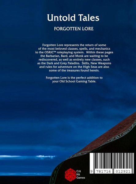 Untold Tales: Forgotten Lore represents the return of some of the most beloved classes, spells, and mechanics to the OSRIC roleplaying system. Within these pages, the Barbarian, Bard, and Monk are waiting to be rediscovered, as well as entirely new classes, such as the Dark and Grey Paladins. Skills, new weapons, and new rules for adventures on the High Seas are also some of the treasures to be found herein.