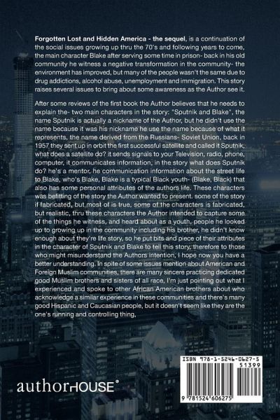 Forgotten Lost and Hidden America 2: Sequel is a continuation of the social issues growing up through the seventies and following years to come. The main character, Blake, after serving some time in prison-back in his old community, he witnessed a negative transformation in the community-the environment has improved, but many of the people weren't the same due to drug addictions, alcohol abuse, unemployment, and immigration. This story raises several issues to bring about some awareness as the author sees it. After some reviews of the first book, the author believes that he needs to explain the two main characters in the story, Sputnik and Blake. The name Sputnik is actually a nickname of the author, but he didn't use the name because it was his nickname. He used the name because of what it represents, the name derived from the Russians, Soviet Union, back in 1957. They sent up in orbit the first successful satellite and called it Sputnik. What does a satellite do? It sends signals to your television, radio, phone, and computer, and it communicates information. In the story, what does Sputnik do? He's a mentor; he communicates information about the street life to Blake. Who's Blake? Blake is a typical Black youth (Blake, black), which also has some personal attributes of the author's life. These characters were befitting of the story the author wanted to present. Some of the story is fabricated, but most of it is true. Some of the characters are fabricated but realistic. Through these characters, the author intended to capture some of the things he witnessed and heard about as a youth. People he looked up to growing up in the community, including his brother, he didn't know enough about their life story, so he put bits and piece of their attributes in the character of Sputnik and Blake to tell this story. Therefore, to those who might misunderstand the author's intention, I hope now you have a better understanding. In spite of some issues mentioned about American and Foreign Muslim communities, there are many sincere, practicing, dedicated, good Muslim brothers and sisters of all races. I'm just pointing out what I experienced and spoke to other African American brothers about, who acknowledge a similar experience in these communities, and there are as many good Hispanic and Caucasian people, but it doesn't seem like they are the ones running and controlling things.