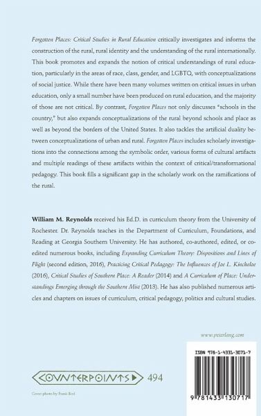 Forgotten Places: Critical Studies in Rural Education critically investigates and informs the construction of the rural, rural identity and the understanding of the rural internationally. This book promotes and expands the notion of critical understandings of rural education, particularly in the areas of race, class, gender, and LGBTQ, with conceptualizations of social justice. While there have been many volumes written on critical issues in urban education, only a small number have been produced on rural education, and the majority of those are not critical. By contrast, Forgotten Places not only discusses "schools in the country," but also expands conceptualizations of the rural beyond schools and place as well as beyond the borders of the United States. It also tackles the artificial duality between conceptualizations of urban and rural. Forgotten Places includes scholarly investigations into the connections among the symbolic order, various forms of cultural artifacts andmultiple readings of these artifacts within the context of critical/transformational pedagogy. This book fills a significant gap in the scholarly work on the ramifications of the rural.