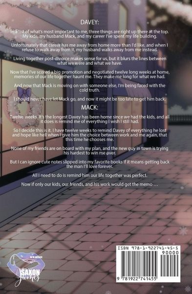 Davey In a list of what's most important to me, three things are right up there at the top. My kids, my husband Mack, and my career I've spent my life building. Unfortunately that career has me away from home more than I'd like, and when I refuse to walk away from it, my husband walks away from me instead. Living together post-divorce makes sense for us, but it blurs the lines between what we were and what we have. Now that I've scored a big promotion and negotiated twelve long weeks at home, memories of our life together haunt me. They make me long for what we had. And now that Mack is moving on with someone else, I'm being faced with the cold truth. I should never have let Mack go, and now it might be too late to get him back. Mack Twelve weeks. It's the longest Davey has been home since we had the kids, and all it does is remind me of everything I wish I still had. So I decide this is it. I have twelve weeks to remind Davey of everything he lost and hope like hell when I give him the choice between work and me again, that this time he chooses me. None of my friends are on board with my plan, and the new guy in town is trying his hardest to win me over. But I can ignore cute notes slipped into my favorite books if it means getting back the man I'll love forever. All I need to do is remind him our life together was perfect. Now if only our kids, our friends, and his work would get the memo...