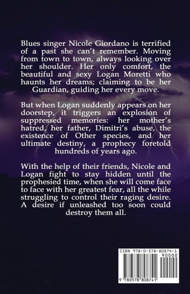 A young woman struggles to overcome an abusive past while a seductive vampire forces her to battle her fears, accept her destiny, and trust him with her heart. Blues singer Nicole Giordano is terrified of a past she can't remember. Moving from town to town, she's always looking over her shoulder. When her only comfort-the beautiful and sexy Logan Moretti who haunts her dreams claiming to be her Guardian-suddenly appears on her doorstep, it triggers an explosion of suppressed memories: her mother's hatred, physical and sexual abuse, the existence of Other species, and her ultimate destiny-a prophecy foretold hundreds of years ago. With the help of their friends, Nicole and Logan fight to stay hidden until the prophesied time when she will come face to face with her greatest fear. All the while, they struggle to control their raging desire-a desire that, if unleashed too soon, could destroy them all.
