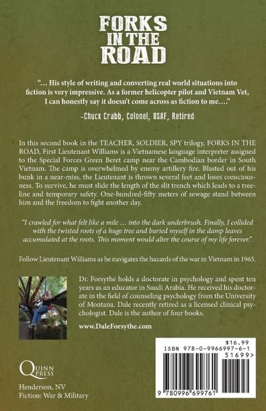 "… His style of writing and converting real world situations into fiction is very impressive. As a former helicopter pilot and Vietnam Vet, I can honestly say it doesn't come across as fiction to me…. -Chuck Crabb, Colonel, USAF, Retired In this second book in the TEACHER, SOLDIER, SPY trilogy, FORKS IN THE ROAD, First Lieutenant Williams is a Vietnamese language interpreter assigned to the Special Forces Green Beret camp near the Cambodian border in South Vietnam. The camp is overwhelmed by enemy artillery fire. Blasted out of his bunk in a near-miss, the Lieutenant is thrown several feet and loses consciousness. To survive, he must slide the length of the slit trench which leads to a tree-line and temporary safety. One-hundred-fifty meters of sewage stand between him and the freedom to fight another day. "I crawled for what felt like a mile … into the dark underbrush. Finally, I collided with the twisted roots of a huge tree and buried myself in the damp leaves accumulated at the roots. This moment would alter the course of my life forever." Follow Lieutenant Williams as he navigates the hazards of the war in Vietnam in 1965. This book is the second, in the Teacher, Soldier, Spy trilogy that chronicles two wars: Vietnam and the Russian Afghan War. The other two books in the trilogy are The Operative: Escape from Saudi Arabia and the Afghan Bear Trap, set in Russia.
