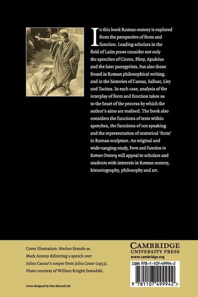 In this book Roman oratory is explored from the perspective of form and function. Leading scholars in the field of Latin prose consider not only the speeches of Cicero, Pliny, Apuleius and the later panegyrists, but also those found in Roman philosophical writing, and in the histories of Caesar, Sallust, Livy and Tacitus. In each case, analysis of the interplay of form and function takes us to the heart of the process by which the author's aims are realised. The book also considers the functions of texts within speeches, the functions of not speaking and the representation of oratorical 'form' in Roman sculpture. An original and wide-ranging study, Form and Function in Roman Oratory will appeal to scholars and students with interests in Roman oratory, historiography, philosophy and art.