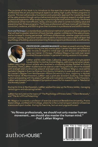 The purpose of this book is to introduce to the exercise science student and fitness professional the art and psychological aspects of selling high-quality fitness programs to anyone. This text will provide a foundation and systematic approach for mastering the art of the sales process through various behavioral and psychological research studies as well as practical experience. After studying and practicing the tools within this book, the fitness professional will be more efficient, sharp, and accurate when it comes to building value and presenting their fitness programs. The fitness professional will have more self-confidence, conviction, credence, and faith to grow their business in a professional and skillful manner. Form and Technique is a standardized, professional method of presenting fitness programs that will lead to greater retention of loyal clientele, greater confidence in the sales process, and an increase in closing percentage. All fitness professionals, whether yoga instructors, strength coaches, or personal trainers and students of exercise science alike will learn the psychology of building value and presenting fitness programs professionally and efficiently.