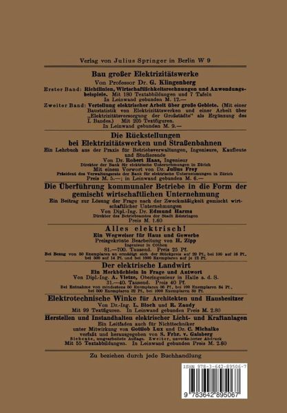 I. Die öffentliche Elektrizitätsversorgung Deutschlands im Jahre 1914/15.- 1. Die allgemeine technische Entwicklung der öffentlichen Elektrizitätsversorgung bis zum Jahre 1914.- 2. Die Verwaltungsformen der öffentlichen Elektrizitätswerke.- 3. Das Eingreifen staatlicher Gewalten in die Elektrizitätsversorgung.- 4. Der Umfang der öffentlichen Elektrizitätsversorgung in Preußen im Jahre 1914/15.- II. Die Vereinheitlichung der Elektrizitätsversorgung in Preußen auf öffentlich-rechtlicher Grundlage.- 1. Die Zweckmäßigkeit einer Zusammenfassung der Elektrizitätsversorgung mit Rücksicht auf.- die Benutzung öffentlichen Grundeigentums.- 2. Die Durchführbarkeit einer einheitlichen Elektrizitätsversorgung auf öffentlich-rechtlicher Grundlage in technischer Beziehung.- 3. Die Schadloshaltung bestehender Elektrizitätsunternehmungen.- 4. Die gesetzliche Regelung der öffentlichen Elektrizitätsversorgung..- III. Das wirtschaftliche Ergebnis einer einheitlichen Elektrizitätsversorgung in Preußen.- 1. Das wirtschaftliche Ergebnis der öffentlichen Elektrizitätswerke Preußens im Jahre 1914/15.- 2. Die voraussichtliche Wirtschaftlichkeit einer einheitlichen Elektrizitätsversorgung in der Zeit um 1926-1930.- 3. Die einheitliche Verwertung des Reinertrages.- IV. Die Besteuerung der Elektrizität.- V. Zusammenfassung der Untersuchungsergebnisse.- VI. Literaturverzeichnis.