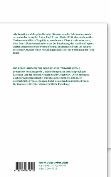 Als Reaktion auf die pluralistische Literatur um die Jahrhundertwende versucht der deutsche Autor Paul Ernst (1866-1933), eine nach antiker Variante modellierte Tragödie zu reetablieren. Diese Arbeit weist nach, dass Ernsts Formenrestitution trotz der Bemühung, der von ihm diagnostizierten zeitgenössischen 'Formauflösung' entgegenzuwirken, um religiös-mystischer Ansätze willen notwendigerweise selbst zur Sprengung der Form führt.