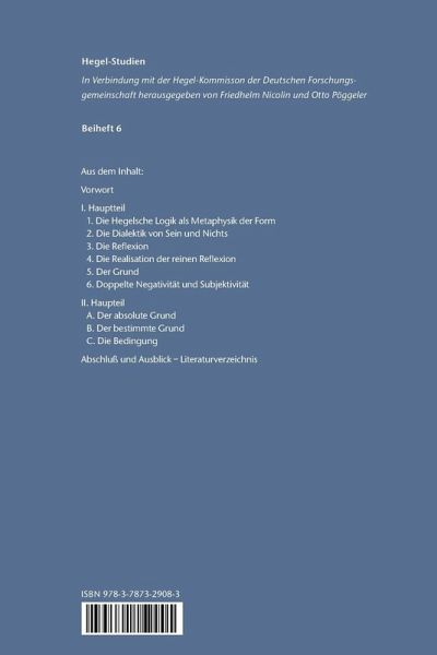 Vorwort I. Hauptteil. 1. Die Hegelsche Logik als Metaphysik der Form. Form und Ding ¿ die erste Definition von Form ¿ Form und Ich ¿ Form und Tätigkeit ¿ Form und Gott ¿ logische Form und Anschauungsform ¿ 2. Die Dialektik von Sein und Nichts. Der Ausdruck »Negativität« ¿ Nichts und Sein am Beginn der Logik ¿ die Paradoxien der Differenz von Form und Sein ¿ das Ding an sich ¿ unmittelbare Einheit ¿ 3. Die Reflexion. Reflexion bei Locke ¿ bei Kant ¿ bei Fichte ¿ Schellings System des transzendentalen Idealismus ¿ Reflexion bei Hegel ¿ reine Reflexion ¿ setzende Reflexion ¿ Sein und Schein ¿ 4. Die Realisation der reinen Reflexion. Die beiden Wege des Wesens ¿ Hegels Seinsbegriff ¿ der Weg in die Unmittelbarkeit ¿ äußere Reflexion ¿ bestimmende Reflexion ¿ der Weg in den Unterschied ¿ der Gegensatz ¿ der Widerspruch ¿ 5. Der Grund. Kants Streitschrift gegen Eberhard ¿ das Hervorbringen von Differenz ¿ der Grund als Einheit von Bestimmtheit und Nichtbestimmtheit ¿ die hervorbringend-vernichtende Tätigkeit des Grundes ¿ ausschließende Reflexion ¿ Fremd- und Selbstbezüglichkeit der Tätigkeit des Wesens ¿ die Wiederherstellung des Seins ¿ die Bewegung des Nichts zu Nichts ¿ Energeia, Monade und sich gleichbleibende Veränderung ¿ das Scheinen der Form ¿ die Vermittlung von Nichts und Sein ¿ der Grund als Vermittlung von Sein und Form ¿ die Anmerkung ¿ 6. Doppelte Negativität und Subjektivität. Schellings System des transzendentalen Idealismus ¿ Hegels Entpsychologisierung der Form ¿ das Fürsichsein ¿ die Endlichkeit ¿ die Subjektivität der doppelten Negativität, das Etwas ¿ die doppelte Negativität als absolute Negativität ¿ Selbst- und Gotteserkenntnis II. Haupteil. A. Der absolute Grund. a. Form und Wesen ¿ b. Form und Materie ¿ c. Form und Inhalt ¿ B. Der bestimmte Grund. a. Der formelle Grund ¿ Die Anmerkung ¿ b. Der reale Grund ¿ Die Anmerkung ¿ c. Der vollständige Grund ¿ C. Die Bedingung. a. Das relativ Unbedingte ¿ b. Das absolute Unbedingte ¿ c. Hervorgang der Sache in die Existenz Abschluß und Ausblick ¿ Literaturverzeichnis
