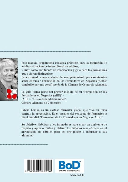 Este manual proporciona consejos prácticos para la formación de adultos situacional e intercultural de adultos, y sirve como una fuente de información y guía para los formadores que quieren distinguirse. Está diseñado como material de acompañamiento para seminarios sobre el tema " Formación de los Formadores en Negocios (AHK)" concluido por una certificación de la Cámara de Comercio Alemana. La guía forma parte del primer módulo de su " Formación de los Formadores en Negocios (AHK)" - (AHK = "Auslandshandelskammer": Cámara Alemana de Comercio).