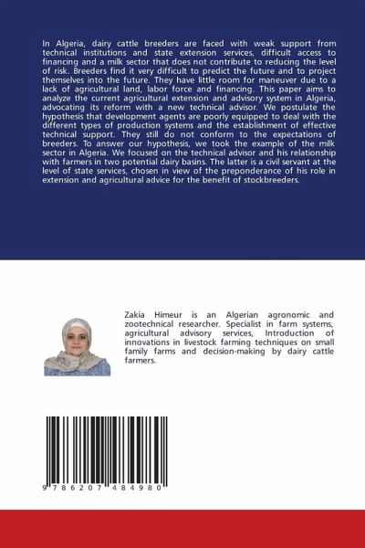 In Algeria, dairy cattle breeders are faced with weak support from technical institutions and state extension services, difficult access to financing and a milk sector that does not contribute to reducing the level of risk. Breeders find it very difficult to predict the future and to project themselves into the future. They have little room for maneuver due to a lack of agricultural land, labor force and financing. This paper aims to analyze the current agricultural extension and advisory system in Algeria, advocating its reform with a new technical advisor. We postulate the hypothesis that development agents are poorly equipped to deal with the different types of production systems and the establishment of effective technical support. They still do not conform to the expectations of breeders. To answer our hypothesis, we took the example of the milk sector in Algeria. We focused on the technical advisor and his relationship with farmers in two potential dairy basins. The latter is a civil servant at the level of state services, chosen in view of the preponderance of his role in extension and agricultural advice for the benefit of stockbreeders.