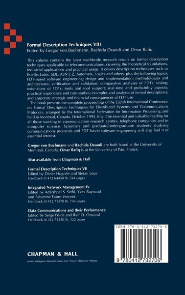 This volume contains the latest worldwide research results on formal description techniques applicable to telecommunications, covering their theoretical foundations, industrial applications and practical usage. The book presents the selected proceedings of the eighth International Conference on Formal Description Techniques, arranged by the International Federation for Information Processing and held in Montreal, Canada, October 1995.