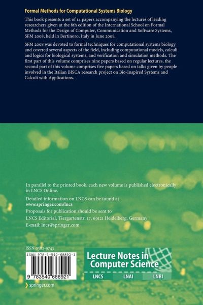 This volume presents the set of papers accompanying the lectures of the eighth International School on Formal Methods for the Design of Computer, Com- nication, and Software Systems (SFM). Thisseriesofschoolsaddressestheuseofformalmethodsincomputerscience asaprominentapproachtotherigorousdesignofcomputer,communication,and software systems. The main aim of the SFM series is to o?er a good spectrum of current research in foundations as well as applications of formal methods, which can be of help for graduate students and young researchers who intend to approach the ?eld. SFM 2008 was devoted to formal techniques for computational systems - ology and covered several aspects of the ?eld, including computational models, calculi and logics for biological systems, and veri?cation and simulation me- ods. Theschoolfeatured not onlyregularlectures, but also talksgivenby people involvedinthe ItalianresearchprojectonBio-InspiredSystems andCalculiwith Applications (BISCA). The ?rst partof this volume comprises nine papers basedon regularlectures. The paper by Degasperi and Gilmore describes the application of sensitivity analysistechniques to stochastic simulation algorithms. Talcott s paper presents pathway logic, an approach to modeling and analysis of biological processes based on rewriting logic. Fages and Soliman study reaction graphs and acti- tion/inhibition graphs used by biologists through formal methods originating from programming theory. The paper by Maus, John, R ohl, and Uhrmacher d- cusses categories, abstraction hierarchies, and composition hierarchies playing a role in modeling and simulation for computational biology. Gillespie s paper - views the theory of stochastic chemical kinetics and several simulation methods that are based on that theory.