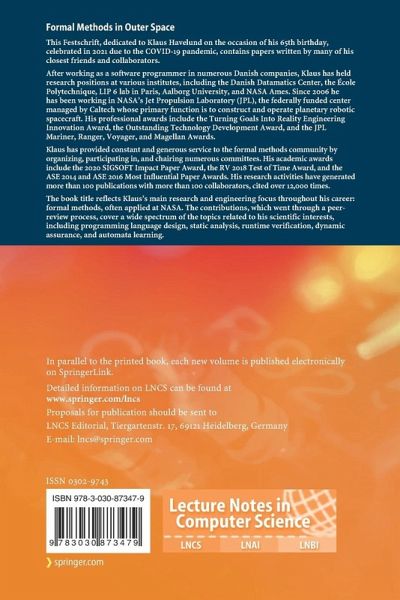 The book title reflects Klaus's main research and engineering focus throughout his career: formal methods, often applied at NASA. The contributions, which went through a peer-review process, cover a wide spectrum of the topics related to his scientific interests, including programming language design, static analysis, runtime verification, dynamic assurance, and automata learning.