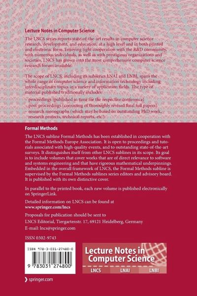 Keynotes.- Symbolic Computation in Automated Program Reasoning.- The next big thing: from embedded systems to embodied actors.- Intelligent and Dependable Decision-Making Under Uncertainty.- A Coq formalization of Lebesgue Induction Principle and Tonelli's Theorem.- SAT/SMT.- Railway Scheduling Using Boolean Satisfiability Modulo Simulations.- SMT Sampling via Model-Guided Approximation.- Efficient SMT-based Network Fault Tolerance Verification.- Verification I.- Formalising the Prevention of Microarchitectural Timing Channels by Operating Systems.- Can we Communicate? Using Dynamic Logic to Verify Team Automata.- The ScalaFix equation solver.- HHLPy: Practical Verification of Hybrid Systems using Hoare Logic.- Quantitative Verification.- symQV: Automated Symbolic Verification of Quantum Programs.- PFL: a Probabilistic Logic for Fault Trees.- Energy BuechiProblems.- QMaude: quantitative specification and verification in rewriting logic.- Concurrency and Memory Models.- Minimisation of Spatial Models using Branching Bisimilarity.- Reasoning about Promises in Weak Memory Models with Event Structures.- A fine-grained semantics for arrays and pointers under weak memory models.- VeyMont: Parallelising Verified Programs instead of Verifying Parallel Programs.- Verification 2.- Verifying At the Level of Java Bytecode.- Abstract Alloy Instances.- Monitoring the Internet Computer.- Word Equations in Synergy with Regular Constraints.- Formal Methods in AI.- Verifying Feedforward Neural Networks for Classification in Isabelle/HOL.- SMPT: A Testbed for Reachabilty Methods in Generalized Petri Nets.- The Octatope Abstract Domain for Verification of Neural Networks.- Program Semantics and Verification Technique for AI-centred Programs.- Safety and Reliability.- Tableaux for Realizability of Safety Specifications.- A Decision Diagram Operation for Reachability.- Formal Modelling of Safety Architecture for Responsibility-AwareAutonomous Vehicle via Event-B Refinement.- A Runtime Environment for Contract Automata.- Industry Day.- Formal and Executable Semantics of the Ethereum Virtual Machine in Dafny.- Shifting Left for Early Detection of Machine-Learning Bugs.- A Systematic Approach to Automotive Security.- Specification-Guided Critical Scenario Identification for Automated Driving.- Runtime Monitoring for Out-of-Distribution Detection in Object Detection Neural Networks.- Backdoor Mitigation in Deep Neural Networks via Strategic Retraining.- veriFIRE: Verifying an Industrial, Learning-Based Wildfire Detection System.