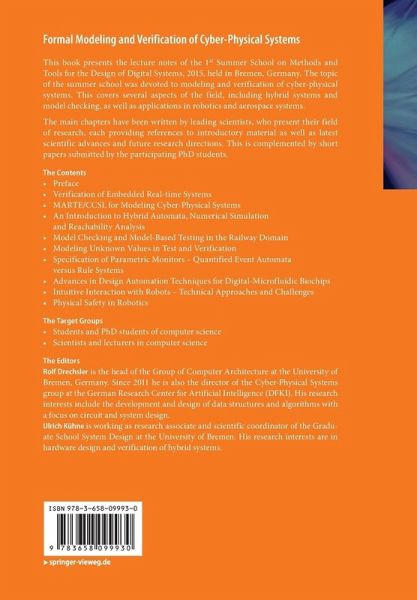 Preface.- Verification of Embedded Real-time Systems.- MARTE/CCSL for Modeling Cyber-Physical Systems.- An Introduction to Hybrid Automata, Numerical Simulation and Reachability Analysis.- Model Checking and Model-Based Testing in the Railway Domain.- Modeling Unknown Values in Test and Verification.- Specification of Parametric Monitors: Quantified Event Automata versus Rule Systems.- Advances in Design Automation Techniques for Digital-Microfluidic Biochips.- Intuitive Interaction with Robots: Technical Approaches and Challenges.- Physical Safety in Robotics.