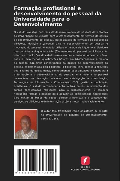 O estudo investiga questões de desenvolvimento do pessoal da biblioteca da Universidade de Estudos para o Desenvolvimento em termos de política de desenvolvimento do pessoal, necessidades de formação do pessoal da biblioteca, dotação orçamental para o desenvolvimento do pessoal e motivação do pessoal. O estudo utilizou o método de inquérito e distribuiu questionários a cinquenta e três (53) membros do pessoal da biblioteca. As principais conclusões do estudo revelaram que a maioria do pessoal sénior possuía, pelo menos, qualificações básicas em biblioteconomia; a maioria do pessoal não tinha conhecimento da política de desenvolvimento do pessoal implementada pela biblioteca; a biblioteca tinha acesso a recursos sob a forma de equipamento, conhecimentos especializados e fundos para a formação e o desenvolvimento do pessoal; e a maioria do pessoal necessitava de formação adicional em catalogação e classificação, Tecnologias de Informação e Comunicação (TIC), gestão e publicação académica. O estudo recomenda, entre outras coisas, a alteração dos cursos considerados relevantes para a biblioteconomia. É também necessário formar o pessoal para adquirir as competências necessárias para utilizar as bases de dados, porque a natureza e o conteúdo dos serviços de biblioteca e de informação estão a mudar muito rapidamente.