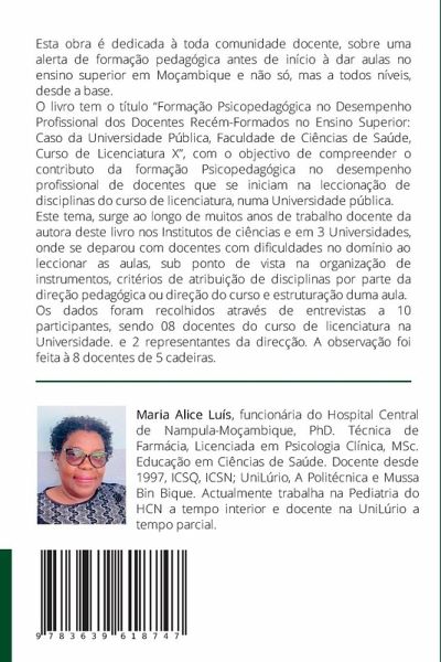 Esta obra é dedicada à toda comunidade docente, sobre uma alerta de formação pedagógica antes de início à dar aulas no ensino superior em Moçambique e não só, mas a todos níveis, desde a base.O livro tem o título "Formação Psicopedagógica no Desempenho Profissional dos Docentes Recém-Formados no Ensino Superior: Caso da Universidade Pública, Faculdade de Ciências de Saúde, Curso de Licenciatura X", com o objectivo de compreender o contributo da formação Psicopedagógica no desempenho profissional de docentes que se iniciam na leccionação de disciplinas do curso de licenciatura, numa Universidade pública.Este tema, surge ao longo de muitos anos de trabalho docente da autora deste livro nos Institutos de ciências e em 3 Universidades, onde se deparou com docentes com dificuldades no domínio ao leccionar as aulas, sub ponto de vista na organização de instrumentos, critérios de atribuição de disciplinas por parte da direção pedagógica ou direção do curso e estruturação duma aula.Os dados foram recolhidos através de entrevistas a 10 participantes, sendo 08 docentes do curso de licenciatura na Universidade. e 2 representantes da direcção. A observação foi feita à 8 docentes de 5 cadeiras.