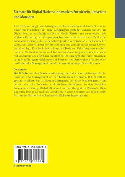 Kira Drössler zeigt, wie Management, Entwicklung und Content von innovativen Formaten für junge Zielgruppen gestaltet werden sollten, um Digital Natives nachhaltig auf Social Media-Plattformen zu erreichen. Mit stetigem Einbezug der Zielgruppencharakteristika entsteht ein Zyklus der Formatentwicklung, der seine Schwerpunkte auf Prozesse, eine flexible Organisation, Diversität bei der Entwicklung und den Einbezug junger Lebensrealitäten legt. Das Buch liefert damit auf Basis von Erkenntnissen aus Journalistik, Medienökonomie und Innovationsforschung sowie aus Interviews mit Akteuren des öffentlich-rechtlichen Onlineangebotes funk praxisrelevante Handlungsempfehlungen auf Format- und Senderebene für innovationsförderndes Management und die Konzeption junger Social Formate.