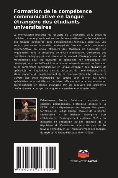 La monographie présente les résultats de la recherche de la thèse de maîtrise. La monographie est consacrée aux problèmes de l'enseignement des langues étrangères dans l'enseignement technique supérieur. Les auteurs présentent le modèle développé de formation de la compétence communicative en langue étrangère des étudiants de spécialités non linguistiques dans le processus de travail indépendant. L'ensemble des conditions pédagogiques est révélé et le manuel d'enseignement et de méthodologie pour les étudiants de spécialités non linguistiques est développé, assurant l'efficacité de la mise en oeuvre du modèle de formation de la compétence communicative en langue étrangère des étudiants de spécialités non linguistiques dans le processus de travail indépendant au stade moderne du développement de la communication interculturelle. Il s'avère que cette technologie est conçue pour donner aux futurs spécialistes la possibilité de participer efficacement à la communication professionnelle en langue étrangère afin de résoudre des problèmes professionnels au moyen de langues maternelles et non maternelles.