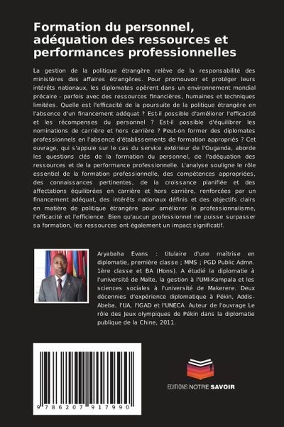 La gestion de la politique étrangère relève de la responsabilité des ministères des affaires étrangères. Pour promouvoir et protéger leurs intérêts nationaux, les diplomates opèrent dans un environnement mondial précaire - parfois avec des ressources financières, humaines et techniques limitées. Quelle est l'efficacité de la poursuite de la politique étrangère en l'absence d'un financement adéquat ? Est-il possible d'améliorer l'efficacité et les récompenses du personnel ? Est-il possible d'équilibrer les nominations de carrière et hors carrière ? Peut-on former des diplomates professionnels en l'absence d'établissements de formation appropriés ? Cet ouvrage, qui s'appuie sur le cas du service extérieur de l'Ouganda, aborde les questions clés de la formation du personnel, de l'adéquation des ressources et de la performance professionnelle. L'analyse souligne le rôle essentiel de la formation professionnelle, des compétences appropriées, des connaissances pertinentes, de la croissance planifiée et des affectations équilibrées en carrière et hors carrière, renforcées par un financement adéquat, des intérêts nationaux définis et des objectifs clairs en matière de politique étrangère pour améliorer le professionnalisme, l'efficacité et l'efficience. Bien qu'aucun professionnel ne puisse surpasser sa formation, les ressources ont également un impact significatif.