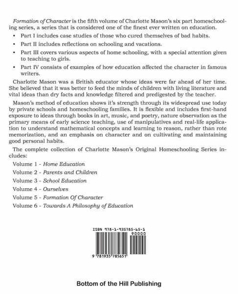 Formation of Character is the fifth volume of Charlotte Mason's six part homeschooling series, a series that is considered one of the finest ever written on education. Part I includes case studies of those who cured themselves of bad habits. Part II includes reflections on schooling and vacations. Part III covers various aspects of home schooling, with a special attention given to teaching to girls. Part IV consists of examples of how education affected the character in famous writers. Charlotte Mason was a British educator whose ideas were far ahead of her time. She believed that it was better to feed the minds of children with living literature and vital ideas than dry facts and knowledge filtered and predigested by the teacher. Mason's method of education shows it's strength through its widespread use today by private schools and homeschooling families. It is flexible and includes first-hand exposure to ideas through books in art, music, and poetry, nature observation as the primary means of early science teaching, use of manipulatives and real-life application to understand mathematical concepts and learning to reason, rather than rote memorization, and an emphasis on character and on cultivating and maintaining good personal habits. The complete collection of Charlotte Mason's Original Homeschooling Series includes: Volume 1 - Home Education Volume 2 - Parents and Children Volume 3 - School Education Volume 4 - Ourselves Volume 5 - Formation Of Character Volume 6 - Towards A Philosophy of Education
