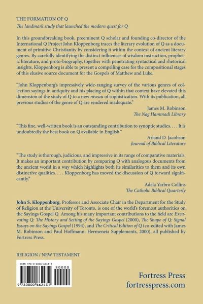In this groundbreaking book, preeminent Q scholar and founding co-director of the International Q Project John Kloppenborg traces the literary evolution of Q as a document of primitive Christianity by considering it within the context of ancient literary genres. By carefully identifying the distinct influences of wisdom instruction, prophetic literature, and proto-biography, together with penetrating syntactical and rhetorical insights, Kloppenborg is able to present a compelling case for the compositional stages of this elusive source document for the Gospels of Matthew and Luke.